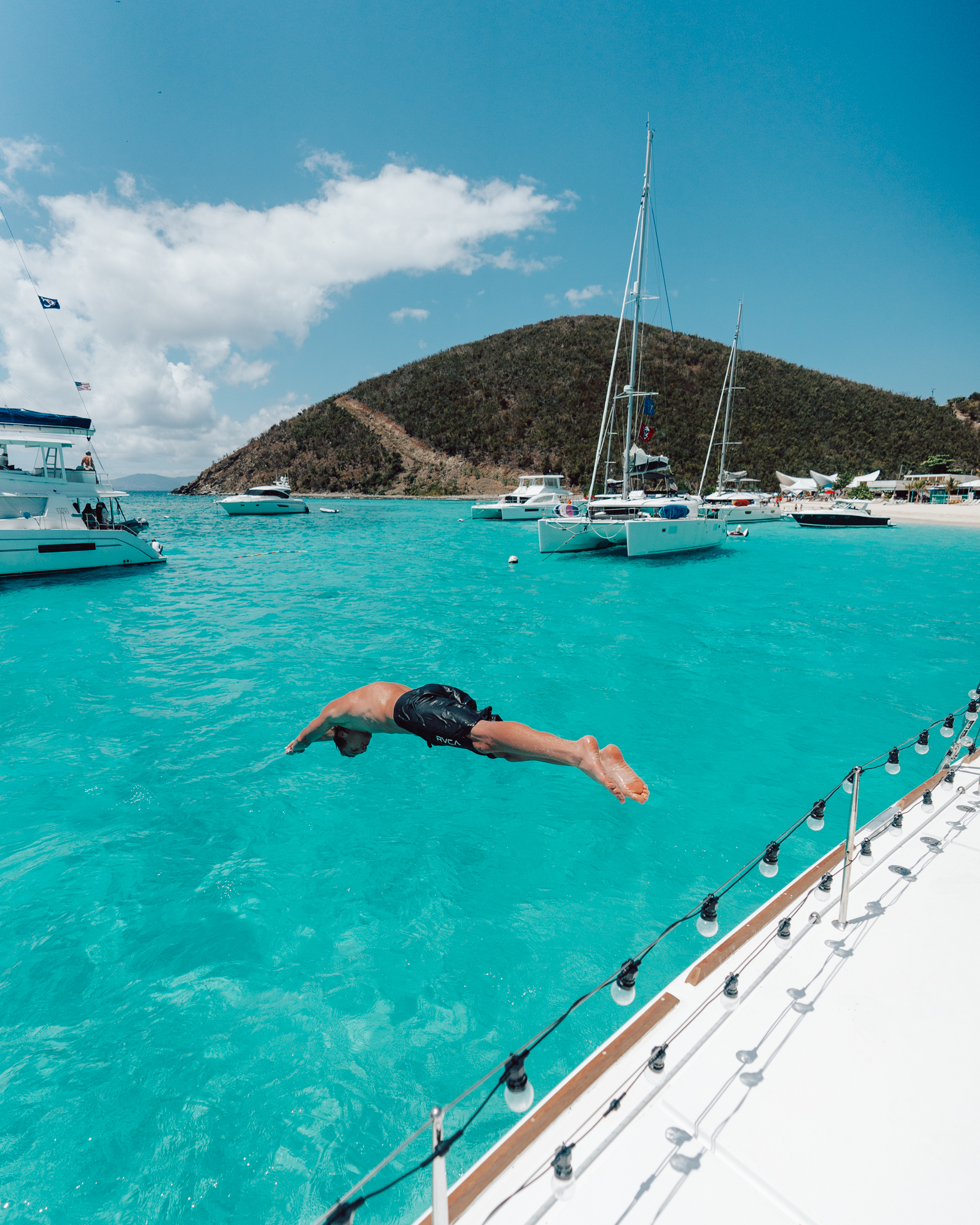 After a delicious breakfast on your floating home, we head to explore the island further on foot with views that make every step worth it! Explore the afternoon away or bring a bottle of rose to share on the beach in the afternoon. We end our day with a classic workout session, and head to the renowned Soggy Dollar Bar for a few evening drinks.